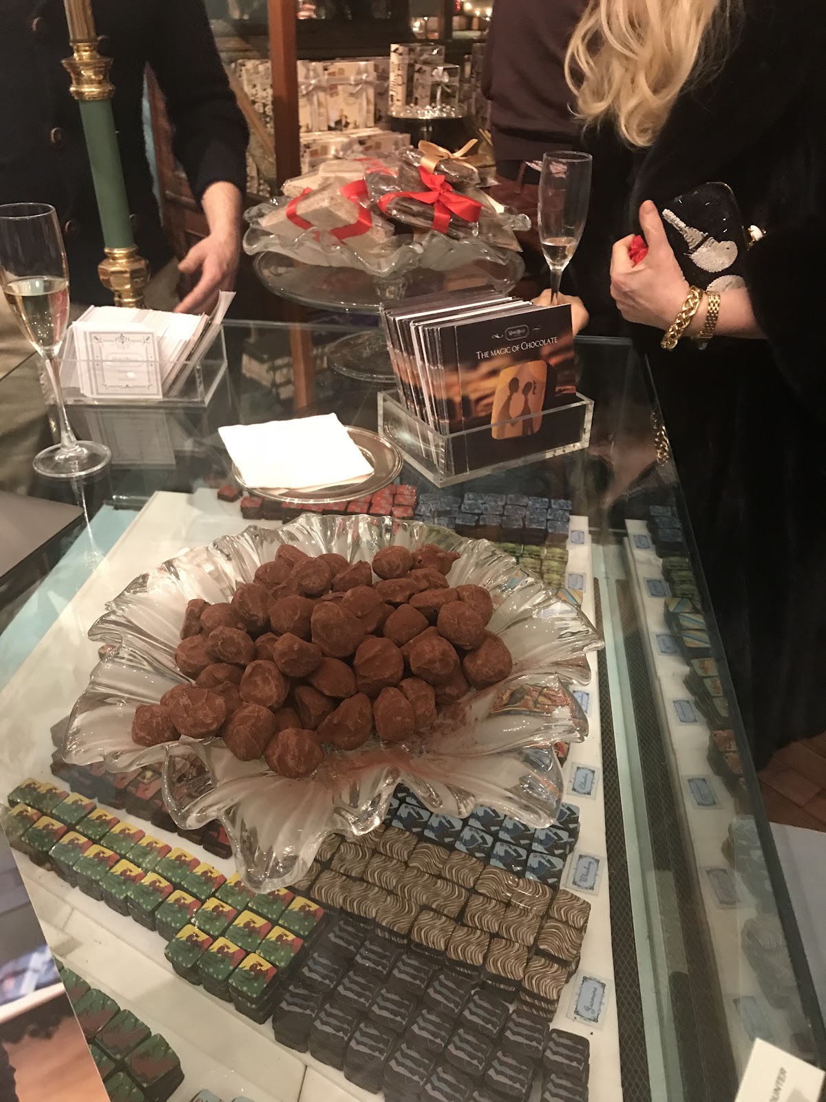 | Check the ruffly glass platter overflowing with cacao-dusted truffles for tasting. Also up for grabs: Green tea truffles made with white chocolate. |